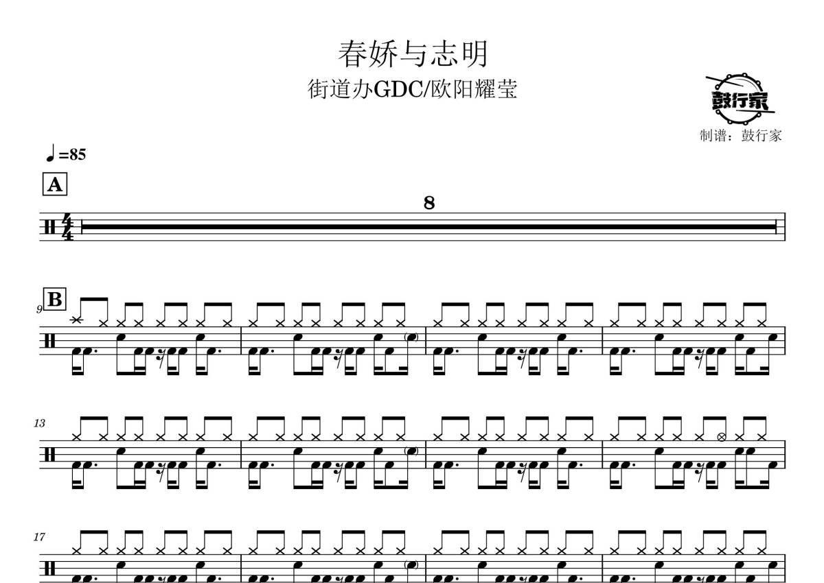 《春娇与志明》是街道办GDC/欧阳耀莹演唱的一首歌曲,拍号为4/4拍,歌曲速度为每分钟85拍,这份鼓谱共有两张高清图谱,图谱由 @鼓行家 编配上传,图谱使用五线谱编配,使用这份春娇与志明架子鼓谱,你将能够轻松地敲打出这首街道办GDC/欧阳耀莹的春娇与志明,快来尝试吧。