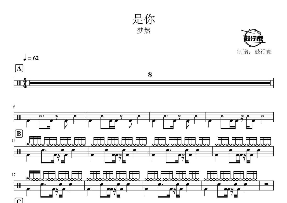 《是你》是梦然演唱的一首歌曲,拍号为4/4拍,歌曲速度为每分钟62拍,这份鼓谱共有一张高清图谱,图谱由 @鼓行家 编配上传,图谱使用五线谱编配,使用这份是你架子鼓谱,你将能够轻松地敲打出这首梦然的是你,快来尝试吧。