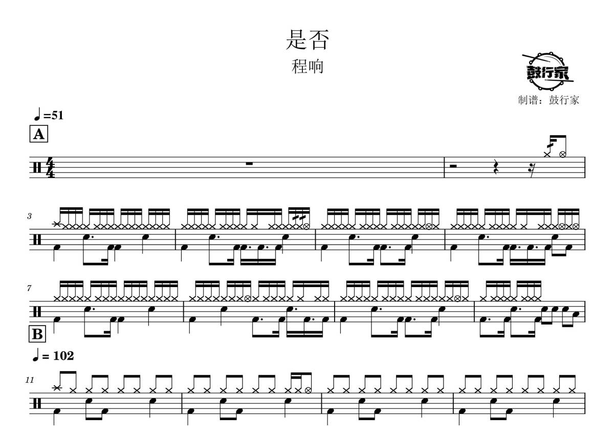 《是否》是程响演唱的一首歌曲,拍号为4/4拍,歌曲速度为每分钟51拍,这份鼓谱共有两张高清图谱,图谱由 @鼓行家 编配上传,图谱使用五线谱编配,使用这份是否架子鼓谱,你将能够轻松地敲打出这首程响的是否,快来尝试吧。