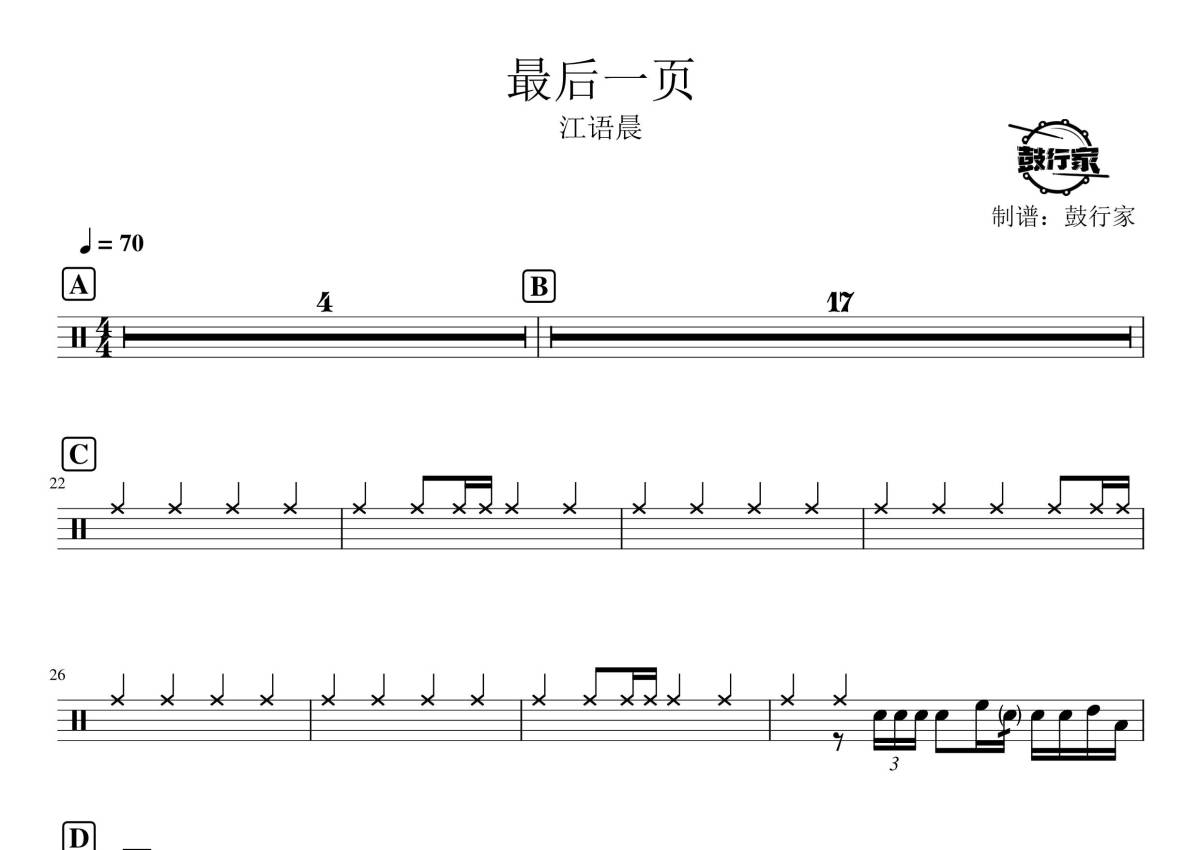 《最后一页》是江语晨演唱的一首歌曲,拍号为4/4拍,歌曲速度为每分钟70拍,这份鼓谱共有两张高清图谱,图谱由 @鼓行家 编配上传,图谱使用五线谱编配,使用这份最后一页架子鼓谱,你将能够轻松地敲打出这首江语晨的最后一页,快来尝试吧。