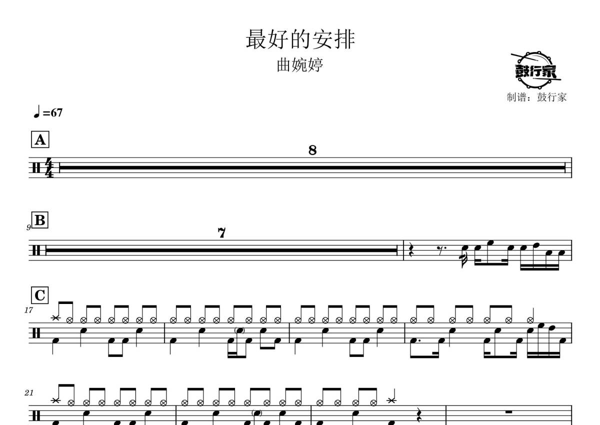 《最好的安排》是曲婉婷演唱的一首歌曲,拍号为4/4拍,歌曲速度为每分钟67拍,这份鼓谱共有两张高清图谱,图谱由 @鼓行家 编配上传,图谱使用五线谱编配,使用这份最好的安排架子鼓谱,你将能够轻松地敲打出这首曲婉婷的最好的安排,快来尝试吧。