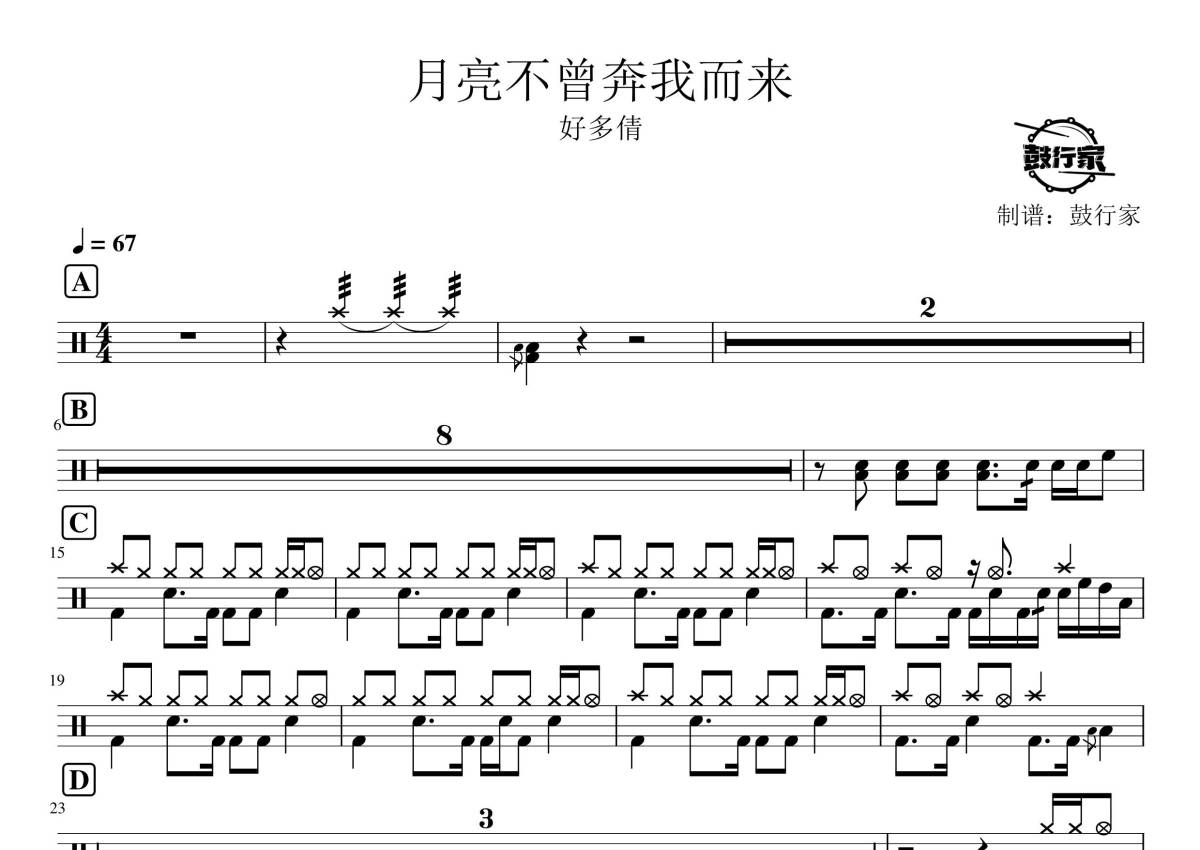 《月亮不曾奔我而来》是好多倩演唱的一首歌曲,拍号为4/4拍,歌曲速度为每分钟67拍,这份鼓谱共有一张高清图谱,图谱由 @鼓行家 编配上传,图谱使用五线谱编配,使用这份月亮不曾奔我而来架子鼓谱,你将能够轻松地敲打出这首好多倩的月亮不曾奔我而来,快来尝试吧。