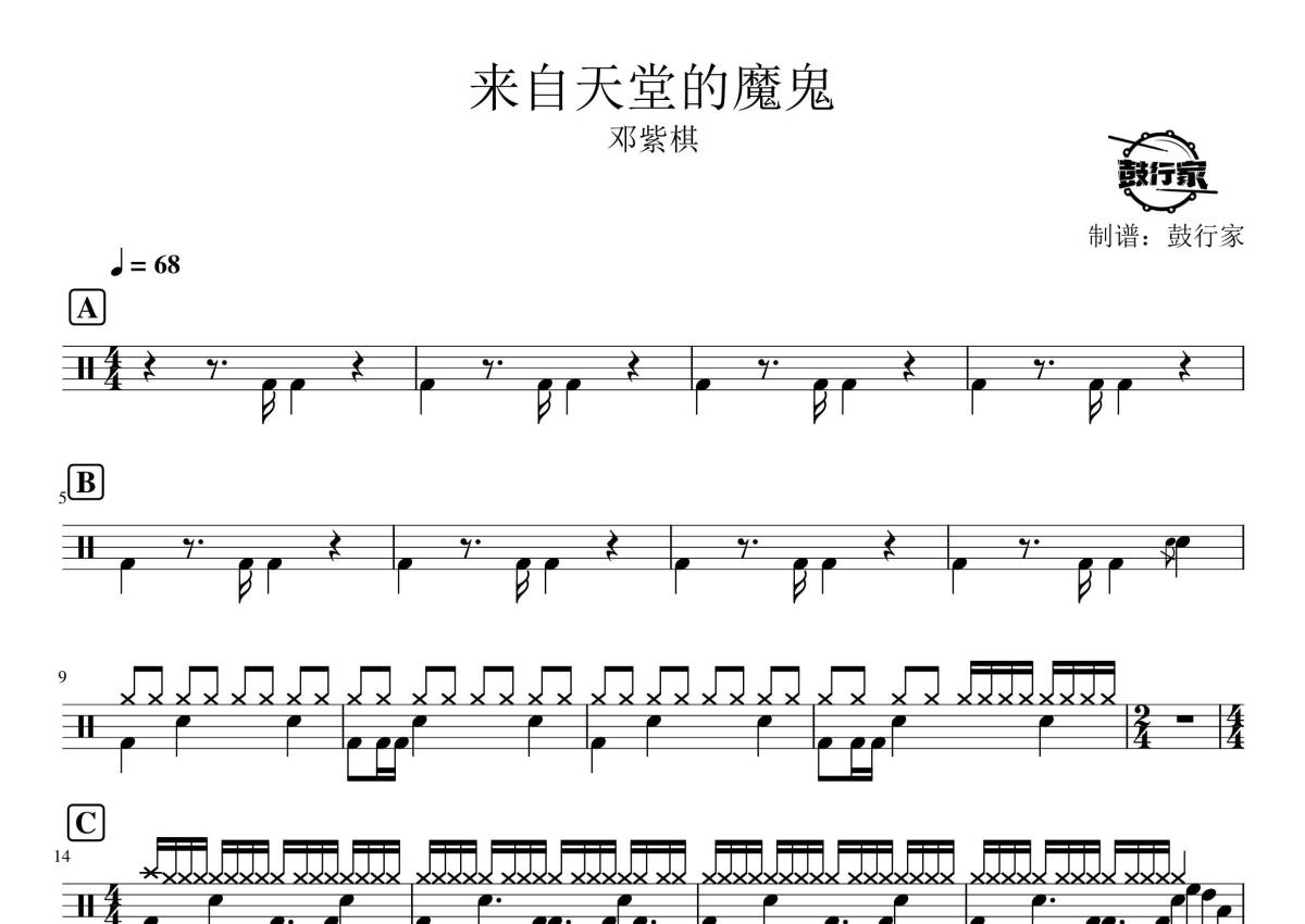 《来自天堂的魔鬼》是邓紫棋演唱的一首歌曲,拍号为4/4拍,歌曲速度为每分钟68拍,这份鼓谱共有两张高清图谱,图谱由 @鼓行家 编配上传,图谱使用五线谱编配,使用这份来自天堂的魔鬼架子鼓谱,你将能够轻松地敲打出这首邓紫棋的来自天堂的魔鬼,快来尝试吧。