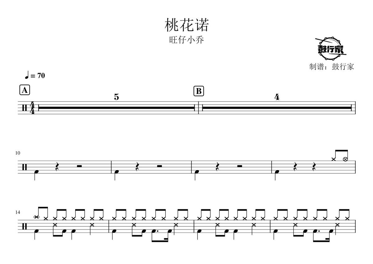 《桃花诺》是旺仔小乔演唱的一首歌曲,拍号为4/4拍,歌曲速度为每分钟70拍,这份鼓谱共有两张高清图谱,图谱由 @鼓行家 编配上传,图谱使用五线谱编配,使用这份桃花诺架子鼓谱,你将能够轻松地敲打出这首旺仔小乔的桃花诺,快来尝试吧。