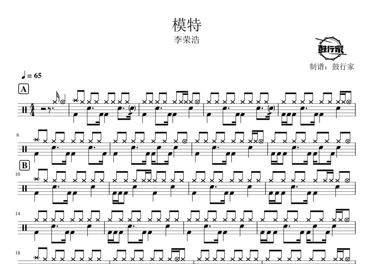 《模特》是李荣浩演唱的一首歌曲,拍号为4/4拍,歌曲速度为每分钟65拍,这份鼓谱共有两张高清图谱,图谱由 @鼓行家 编配上传,图谱使用五线谱编配,使用这份模特架子鼓谱,你将能够轻松地敲打出这首李荣浩的模特,快来尝试吧。