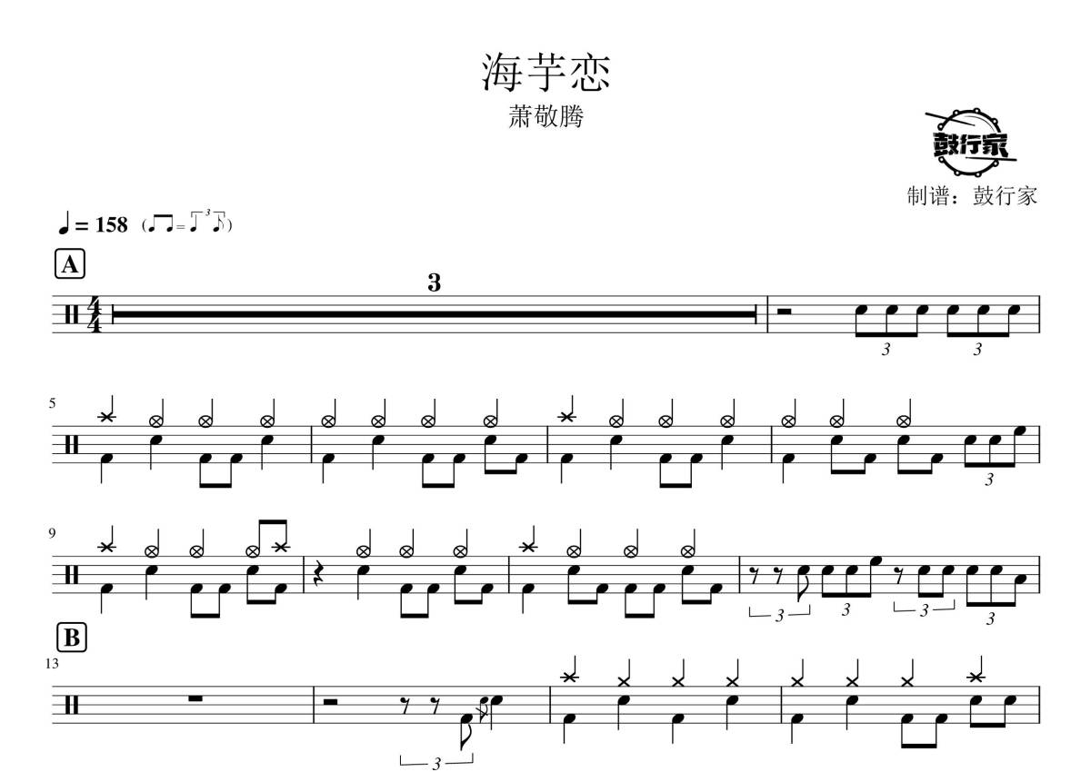 《海芋恋》是萧敬腾演唱的一首歌曲,拍号为4/4拍,歌曲速度为每分钟158拍,这份鼓谱共有四张高清图谱,图谱由 @鼓行家 编配上传,图谱使用五线谱编配,使用这份海芋恋架子鼓谱,你将能够轻松地敲打出这首萧敬腾的海芋恋,快来尝试吧。