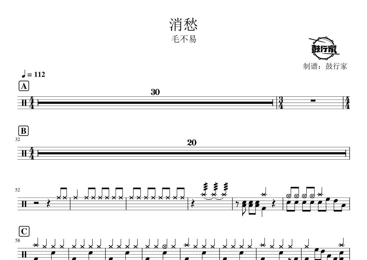 《消愁》是毛不易演唱的一首歌曲,拍号为4/4拍,歌曲速度为每分钟112拍,这份鼓谱共有一张高清图谱,图谱由 @鼓行家 编配上传,图谱使用五线谱编配,使用这份消愁架子鼓谱,你将能够轻松地敲打出这首毛不易的消愁,快来尝试吧。