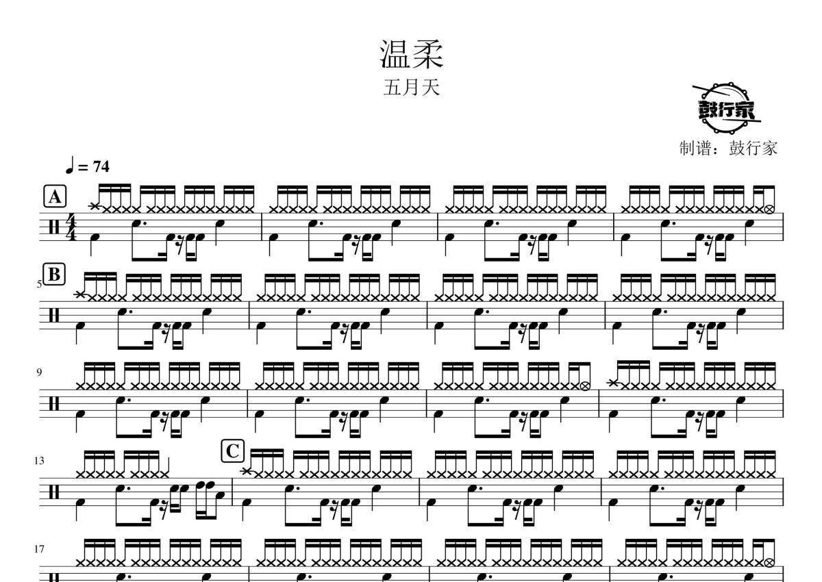 《温柔》是五月天演唱的一首歌曲,拍号为4/4拍,歌曲速度为每分钟74拍,这份鼓谱共有两张高清图谱,图谱由 @鼓行家 编配上传,图谱使用五线谱编配,使用这份温柔架子鼓谱,你将能够轻松地敲打出这首五月天的温柔,快来尝试吧。