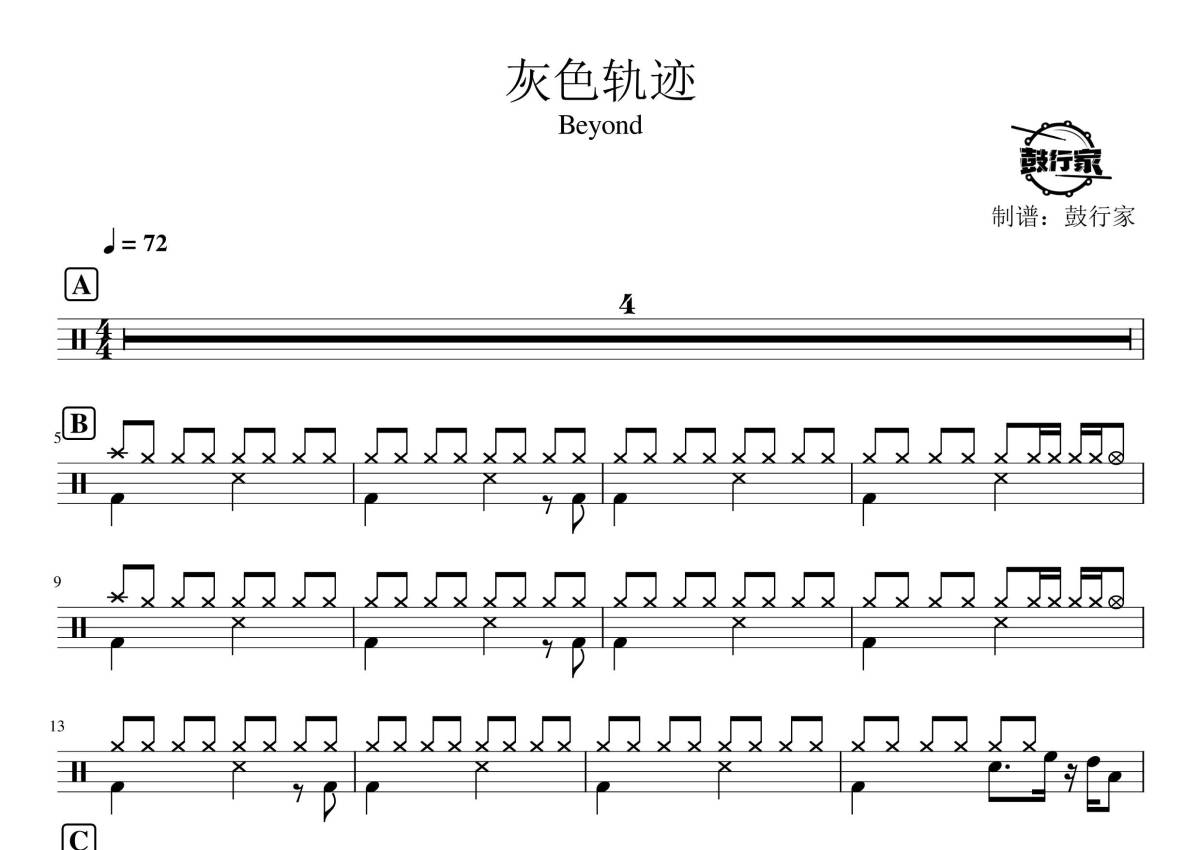 《灰色轨迹》是Beyond演唱的一首歌曲,拍号为4/4拍,歌曲速度为每分钟72拍,这份鼓谱共有两张高清图谱,图谱由 @鼓行家 编配上传,图谱使用五线谱编配,使用这份灰色轨迹架子鼓谱,你将能够轻松地敲打出这首Beyond的灰色轨迹,快来尝试吧。