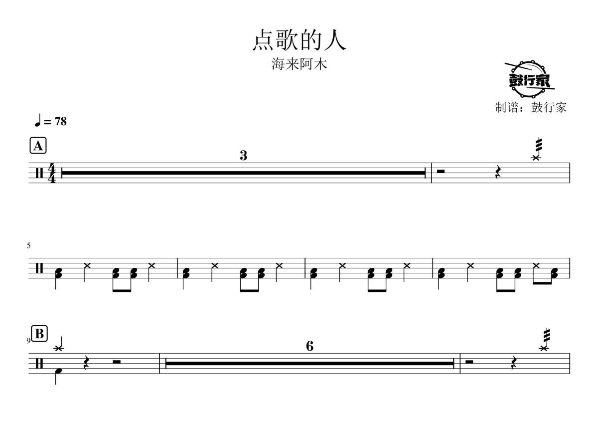 《点歌的人》是海来阿木演唱的一首歌曲,拍号为4/4拍,歌曲速度为每分钟78拍,这份鼓谱共有两张高清图谱,图谱由 @鼓行家 编配上传,图谱使用五线谱编配,使用这份点歌的人架子鼓谱,你将能够轻松地敲打出这首海来阿木的点歌的人,快来尝试吧。