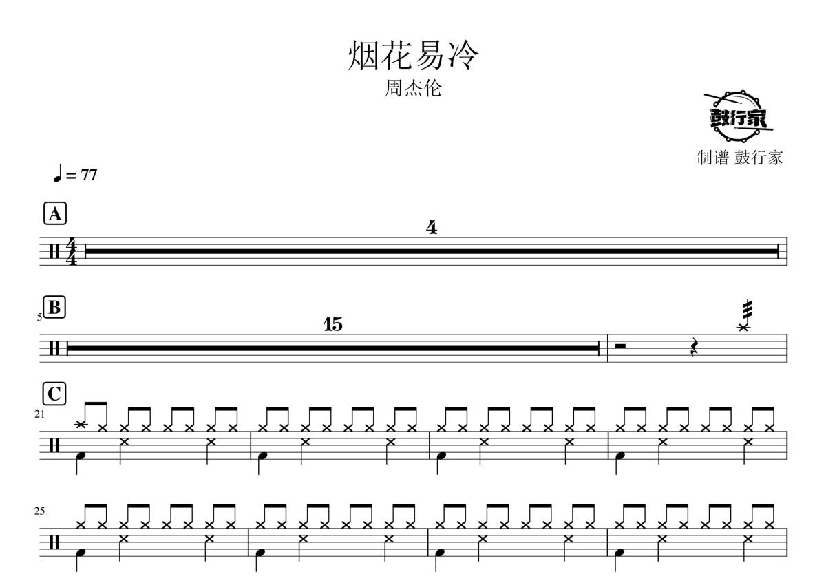 《烟花易冷》是周杰伦演唱的一首歌曲,拍号为4/4拍,歌曲速度为每分钟77拍,这份鼓谱共有两张高清图谱,图谱由 @鼓行家 编配上传,图谱使用五线谱编配,使用这份烟花易冷架子鼓谱,你将能够轻松地敲打出这首周杰伦的烟花易冷,快来尝试吧。