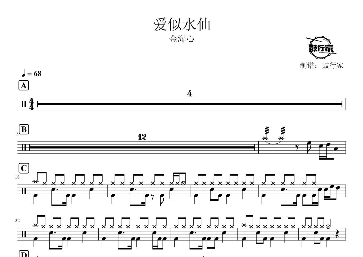 《爱似水仙》是金海心演唱的一首歌曲,拍号为4/4拍,歌曲速度为每分钟68拍,这份鼓谱共有两张高清图谱,图谱由 @鼓行家 编配上传,图谱使用五线谱编配,使用这份爱似水仙架子鼓谱,你将能够轻松地敲打出这首金海心的爱似水仙,快来尝试吧。