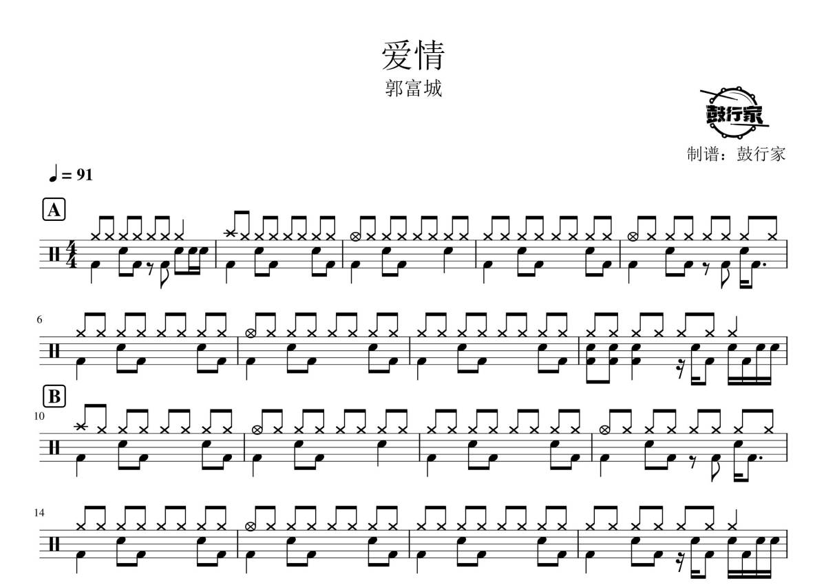 《爱情》是郭富城演唱的一首歌曲,拍号为4/4拍,歌曲速度为每分钟91拍,这份鼓谱共有两张高清图谱,图谱由 @鼓行家 编配上传,图谱使用五线谱编配,使用这份爱情架子鼓谱,你将能够轻松地敲打出这首郭富城的爱情,快来尝试吧。
