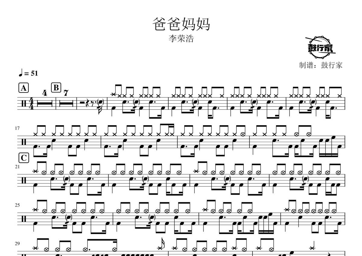 李荣浩《爸爸妈妈》鼓谱 - 架子鼓谱