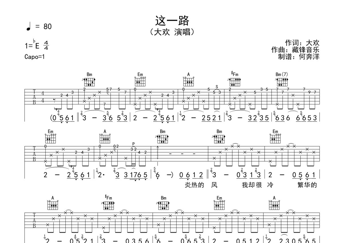 大欢《这一路》吉他谱 - D调弹唱六线谱
