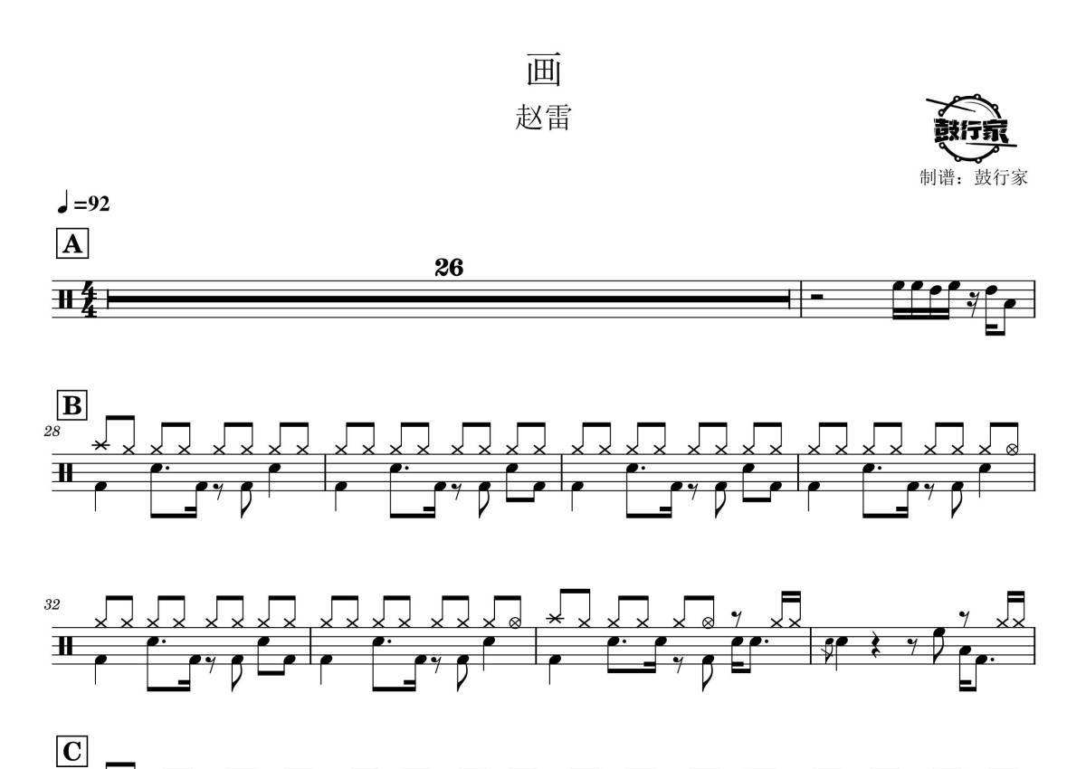 《画》是赵雷演唱的一首歌曲,拍号为4/4拍,歌曲速度为每分钟92拍,这份架子鼓谱共有两张高清图谱,图谱由 @鼓行家 编配上传,图谱使用五线谱编配,使用这份画架子鼓谱,你将能够轻松地敲打出这首赵雷的画,快来尝试吧。