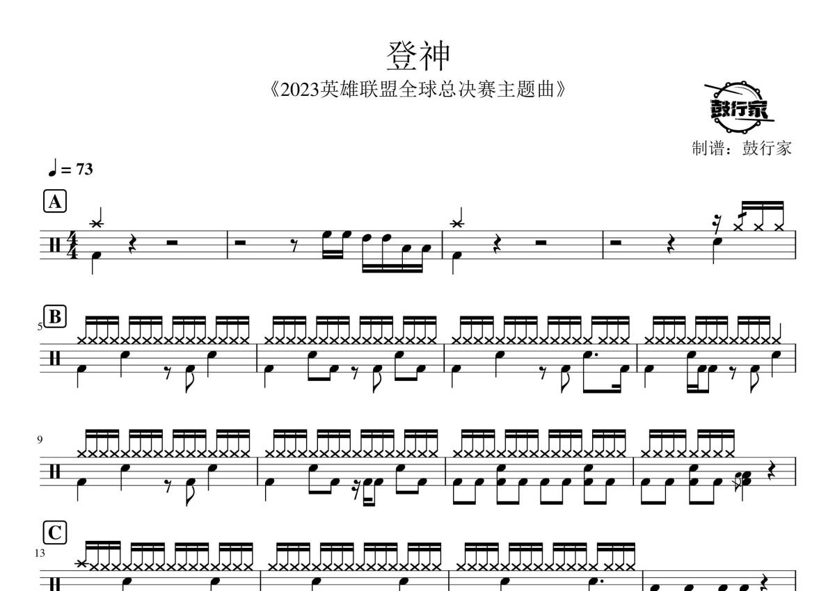 《登神》是2023英雄联盟全球总决赛主题曲演唱的一首歌曲,拍号为4/4拍,歌曲速度为每分钟73拍,这份架子鼓谱共有两张高清图谱,图谱由 @鼓行家 编配上传,图谱使用五线谱编配,使用这份登神架子鼓谱,你将能够轻松地敲打出这首2023英雄联盟全球总决赛主题曲的登神,快来尝试吧。