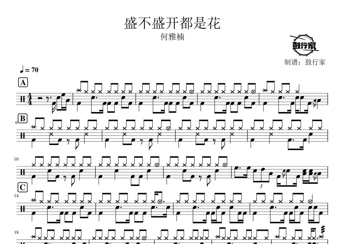 《盛不盛开都是花》是何雅楠演唱的一首歌曲,拍号为4/4拍,歌曲速度为每分钟70拍,这份架子鼓谱共有一张高清图谱,图谱由 @鼓行家 编配上传,图谱使用五线谱编配,使用这份盛不盛开都是花架子鼓谱,你将能够轻松地敲打出这首何雅楠的盛不盛开都是花,快来尝试吧。