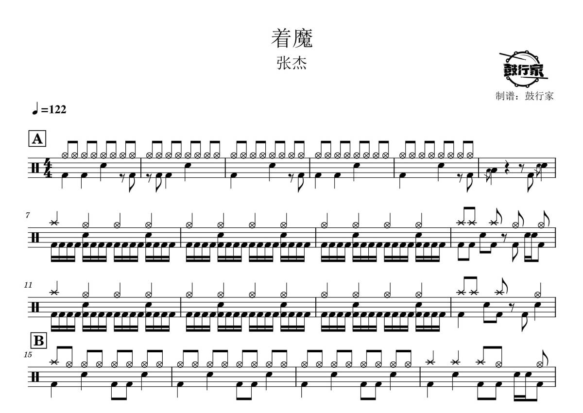 《着魔》是张杰演唱的一首歌曲,拍号为4/4拍,歌曲速度为每分钟122拍,这份架子鼓谱共有三张高清图谱,图谱由 @鼓行家 编配上传,图谱使用五线谱编配,使用这份着魔架子鼓谱,你将能够轻松地敲打出这首张杰的着魔,快来尝试吧。