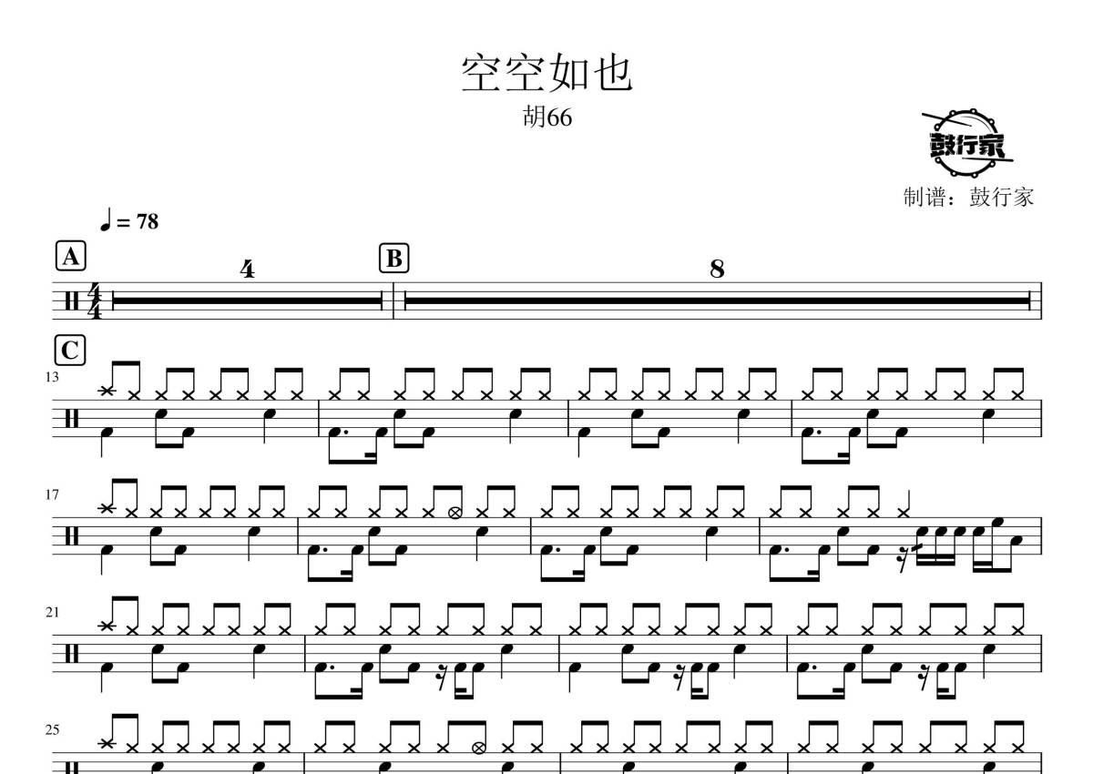 《空空如也》是胡66演唱的一首歌曲,拍号为4/4拍,歌曲速度为每分钟78拍,这份架子鼓谱共有一张高清图谱,图谱由 @鼓行家 编配上传,图谱使用五线谱编配,使用这份空空如也架子鼓谱,你将能够轻松地敲打出这首胡66的空空如也,快来尝试吧。
