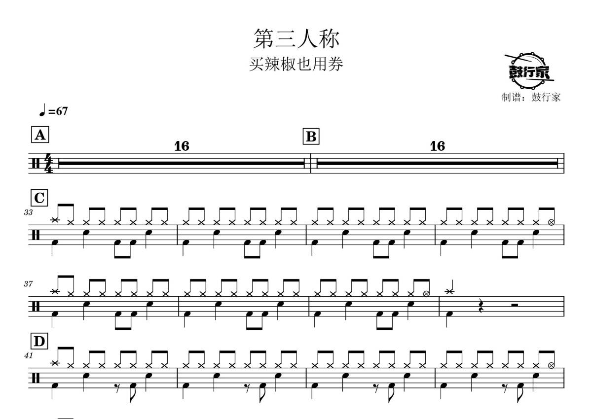 《第三人称》是买辣椒也用券演唱的一首歌曲,拍号为4/4拍,歌曲速度为每分钟67拍,这份架子鼓谱共有一张高清图谱,图谱由 @鼓行家 编配上传,图谱使用五线谱编配,使用这份第三人称架子鼓谱,你将能够轻松地敲打出这首买辣椒也用券的第三人称,快来尝试吧。