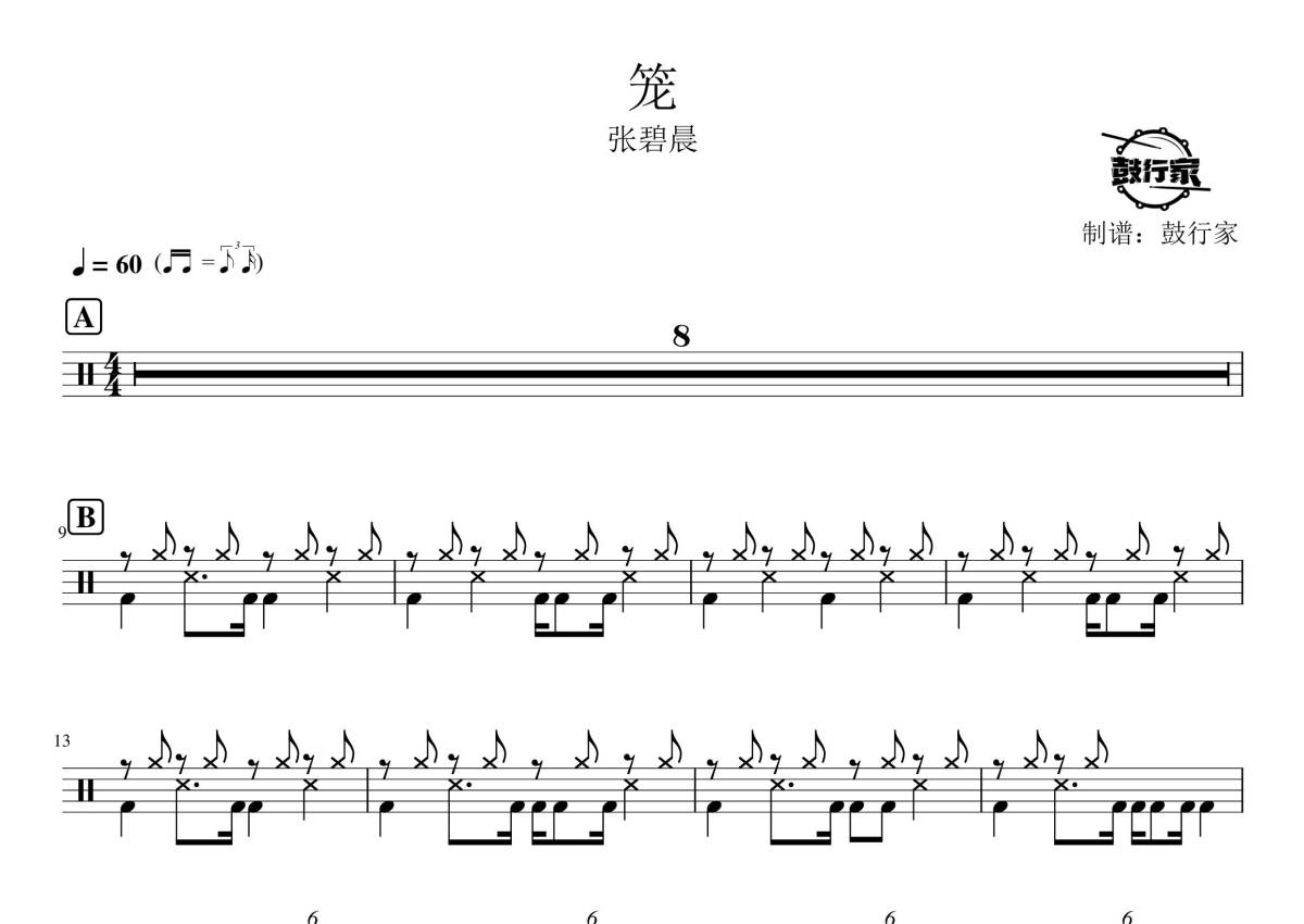 《笼》是张碧晨演唱的一首歌曲,拍号为4/4拍,歌曲速度为每分钟60拍,这份架子鼓谱共有两张高清图谱,图谱由 @鼓行家 编配上传,图谱使用五线谱编配,使用这份笼架子鼓谱,你将能够轻松地敲打出这首张碧晨的笼,快来尝试吧。