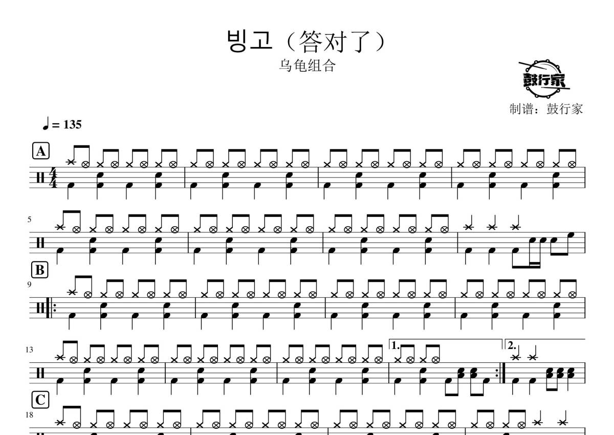 《答对了》是Turtles演唱的一首歌曲,拍号为4/4拍,歌曲速度为每分钟135拍,这份架子鼓谱共有两张高清图谱,图谱由 @鼓行家 编配上传,图谱使用五线谱编配,使用这份答对了架子鼓谱,你将能够轻松地敲打出这首Turtles的答对了,快来尝试吧。