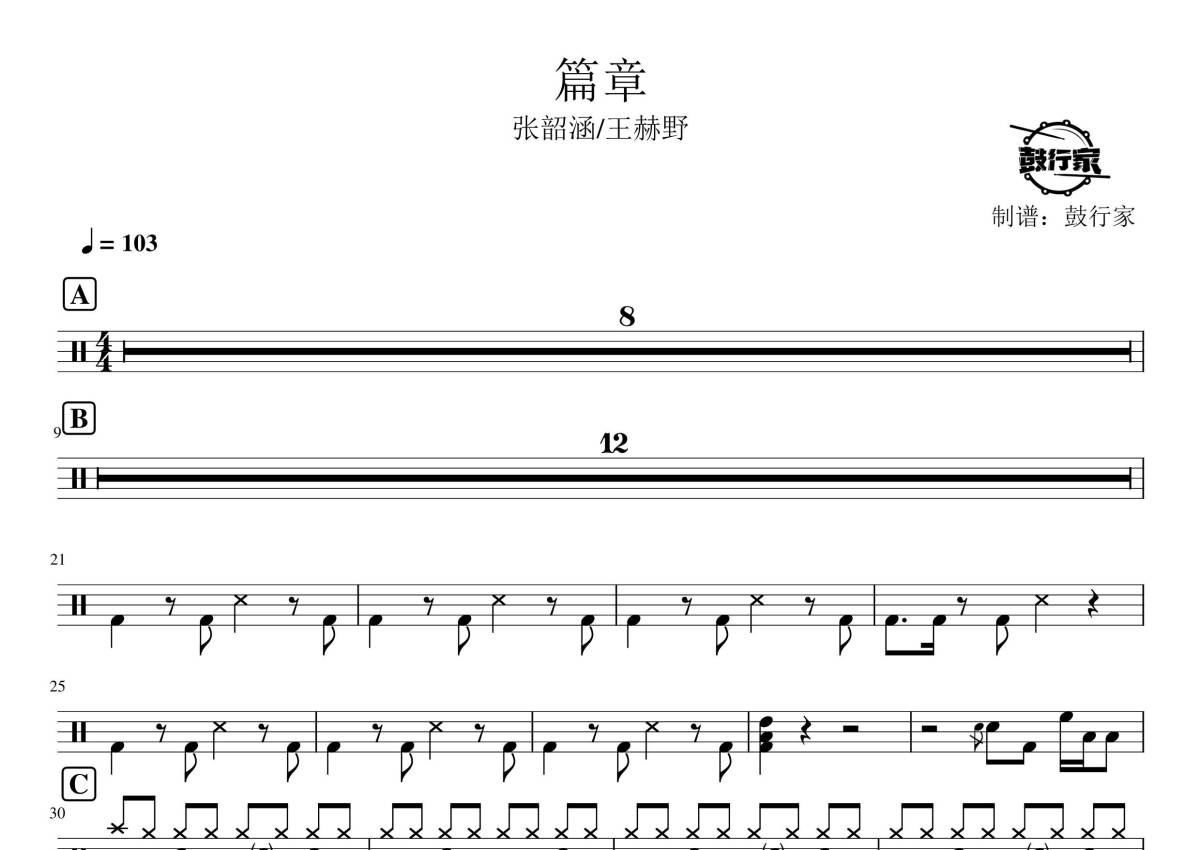 《篇章》是张韶涵/王赫野演唱的一首歌曲,拍号为4/4拍,歌曲速度为每分钟103拍,这份架子鼓谱共有两张高清图谱,图谱由 @鼓行家 编配上传,图谱使用五线谱编配,使用这份篇章架子鼓谱,你将能够轻松地敲打出这首张韶涵/王赫野的篇章,快来尝试吧。
