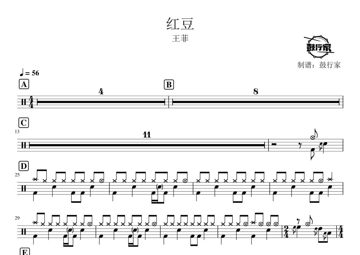 《红豆》是王菲演唱的一首歌曲,拍号为4/4拍,歌曲速度为每分钟56拍,这份架子鼓谱共有一张高清图谱,图谱由 @鼓行家 编配上传,图谱使用五线谱编配,使用这份红豆架子鼓谱,你将能够轻松地敲打出这首王菲的红豆,快来尝试吧。
