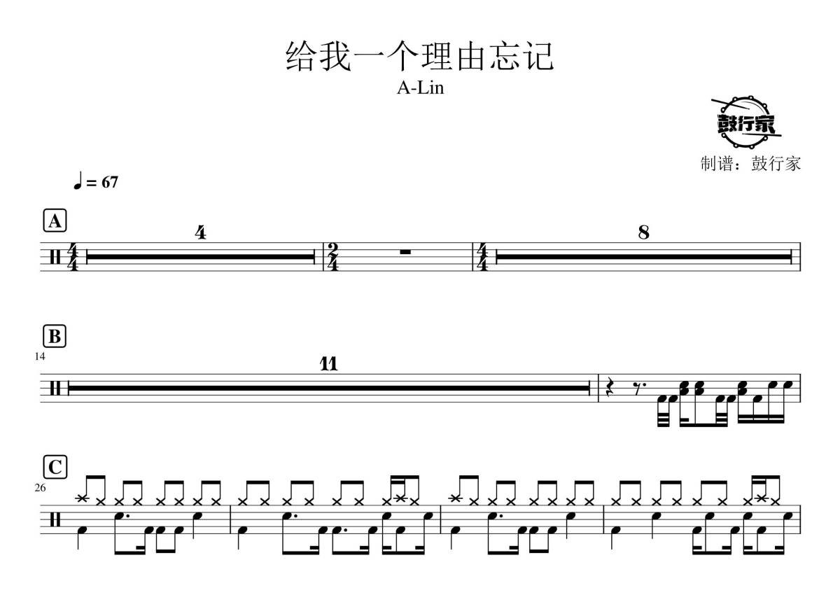 《给我一个理由忘记》是A-Lin演唱的一首歌曲,拍号为4/4拍,歌曲速度为每分钟67拍,这份架子鼓谱共有两张高清图谱,图谱由 @鼓行家 编配上传,图谱使用五线谱编配,使用这份给我一个理由忘记架子鼓谱,你将能够轻松地敲打出这首A-Lin的给我一个理由忘记,快来尝试吧。