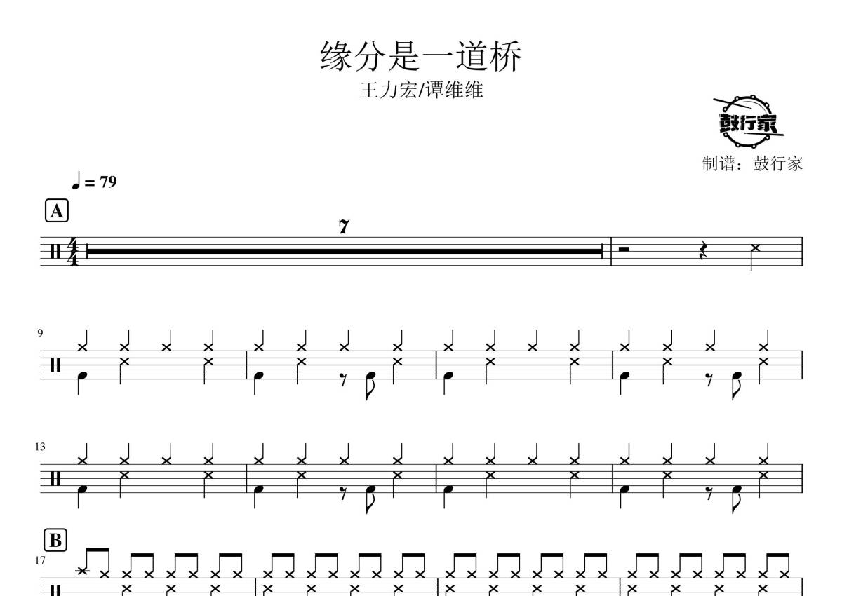 《缘分是一道桥》是王力宏/谭维维演唱的一首歌曲,拍号为4/4拍,歌曲速度为每分钟79拍,这份架子鼓谱共有两张高清图谱,图谱由 @鼓行家 编配上传,图谱使用五线谱编配,使用这份缘分是一道桥架子鼓谱,你将能够轻松地敲打出这首王力宏/谭维维的缘分是一道桥,快来尝试吧。