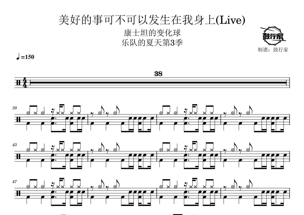 《美好的事可不可以发生在我身上》是康士坦的变化球演唱的一首歌曲,live,拍号为4/4拍,歌曲速度为每分钟150拍,这份架子鼓谱共有四张高清图谱,图谱由 @鼓行家 编配上传,图谱使用五线谱编配,使用这份美好的事可不可以发生在我身上架子鼓谱,你将能够轻松地敲打出这首康士坦的变化球的美好的事可不可以发生在我身上,快来尝试吧。