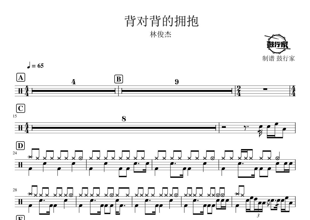 《背对背的拥抱》是林俊杰演唱的一首歌曲,拍号为4/4拍,歌曲速度为每分钟65拍,这份架子鼓谱共有一张高清图谱,图谱由 @鼓行家 编配上传,图谱使用五线谱编配,使用这份背对背的拥抱架子鼓谱,你将能够轻松地敲打出这首林俊杰的背对背的拥抱,快来尝试吧。