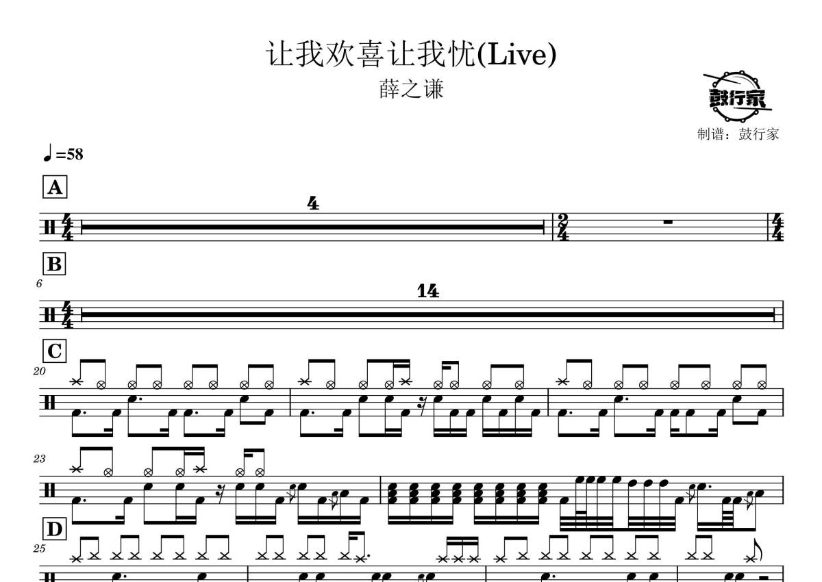 《让我欢喜让我忧》是周华健演唱的一首歌曲,live,拍号为4/4拍,歌曲速度为每分钟58拍,这份架子鼓谱共有一张高清图谱,图谱由 @鼓行家 编配上传,图谱使用五线谱编配,使用这份让我欢喜让我忧架子鼓谱,你将能够轻松地敲打出这首周华健的让我欢喜让我忧,快来尝试吧。