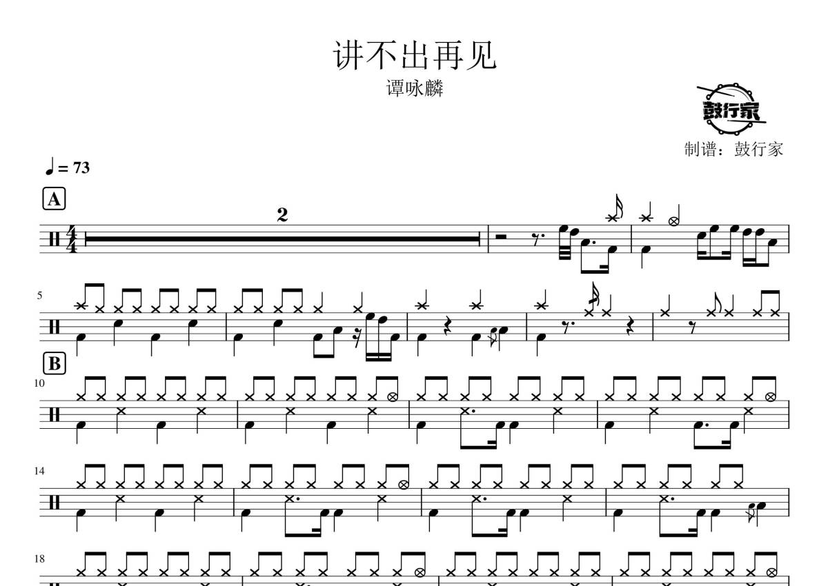 《讲不出再见》是谭咏麟演唱的一首歌曲,拍号为4/4拍,歌曲速度为每分钟73拍,这份架子鼓谱共有两张高清图谱,图谱由 @鼓行家 编配上传,图谱使用五线谱编配,使用这份讲不出再见架子鼓谱,你将能够轻松地敲打出这首谭咏麟的讲不出再见,快来尝试吧。