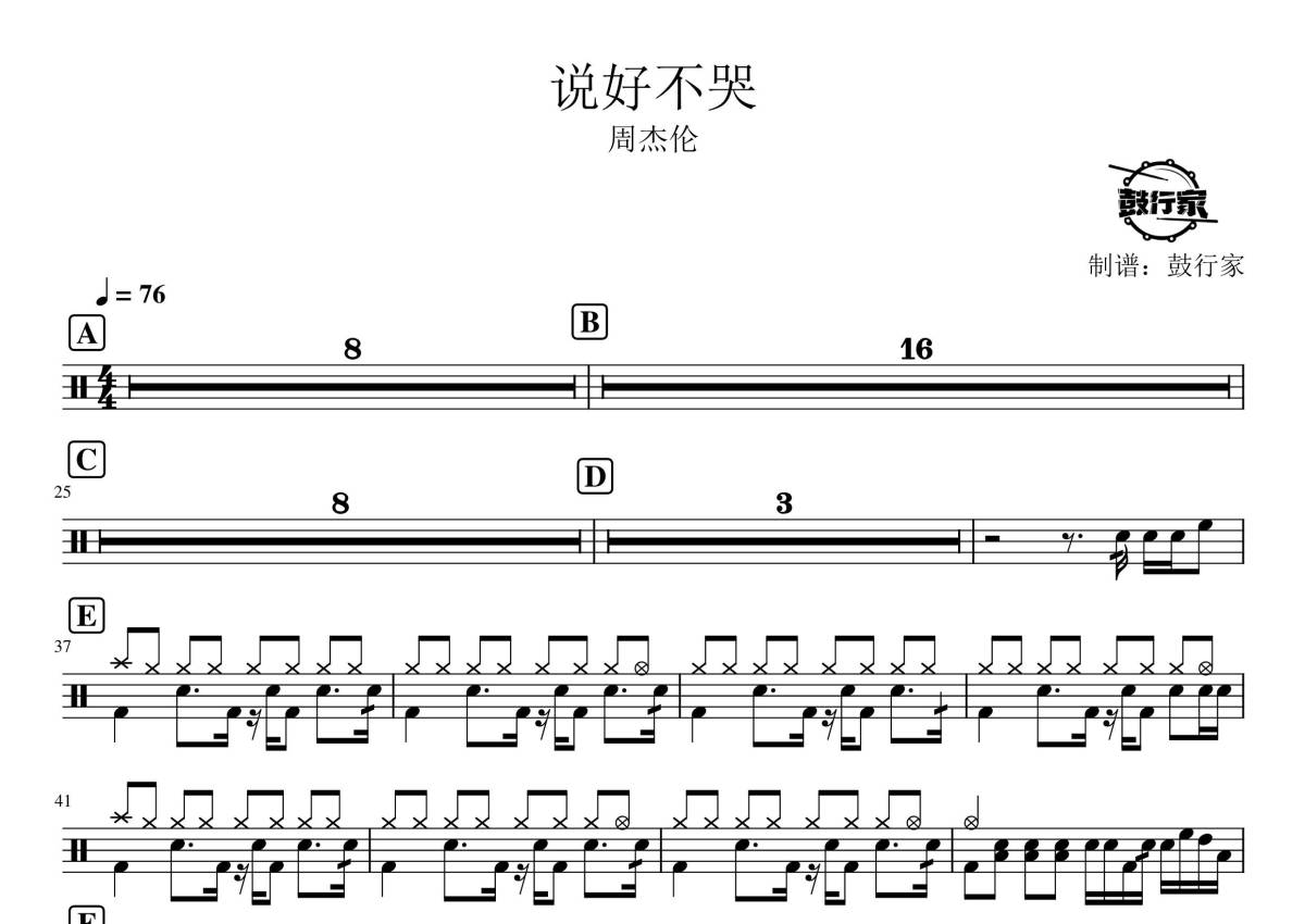 《说好不哭》是周杰伦演唱的一首歌曲,拍号为4/4拍,歌曲速度为每分钟76拍,这份架子鼓谱共有一张高清图谱,图谱由 @鼓行家 编配上传,图谱使用五线谱编配,使用这份说好不哭架子鼓谱,你将能够轻松地敲打出这首周杰伦的说好不哭,快来尝试吧。