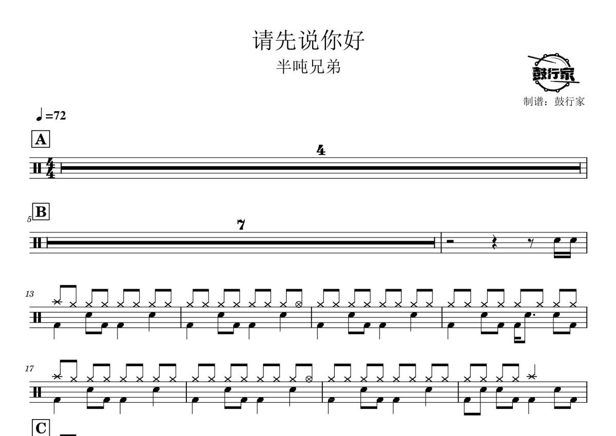 《请先说你好》是半吨兄弟演唱的一首歌曲,拍号为4/4拍,歌曲速度为每分钟72拍,这份架子鼓谱共有两张高清图谱,图谱由 @鼓行家 编配上传,图谱使用五线谱编配,使用这份请先说你好架子鼓谱,你将能够轻松地敲打出这首半吨兄弟的请先说你好,快来尝试吧。