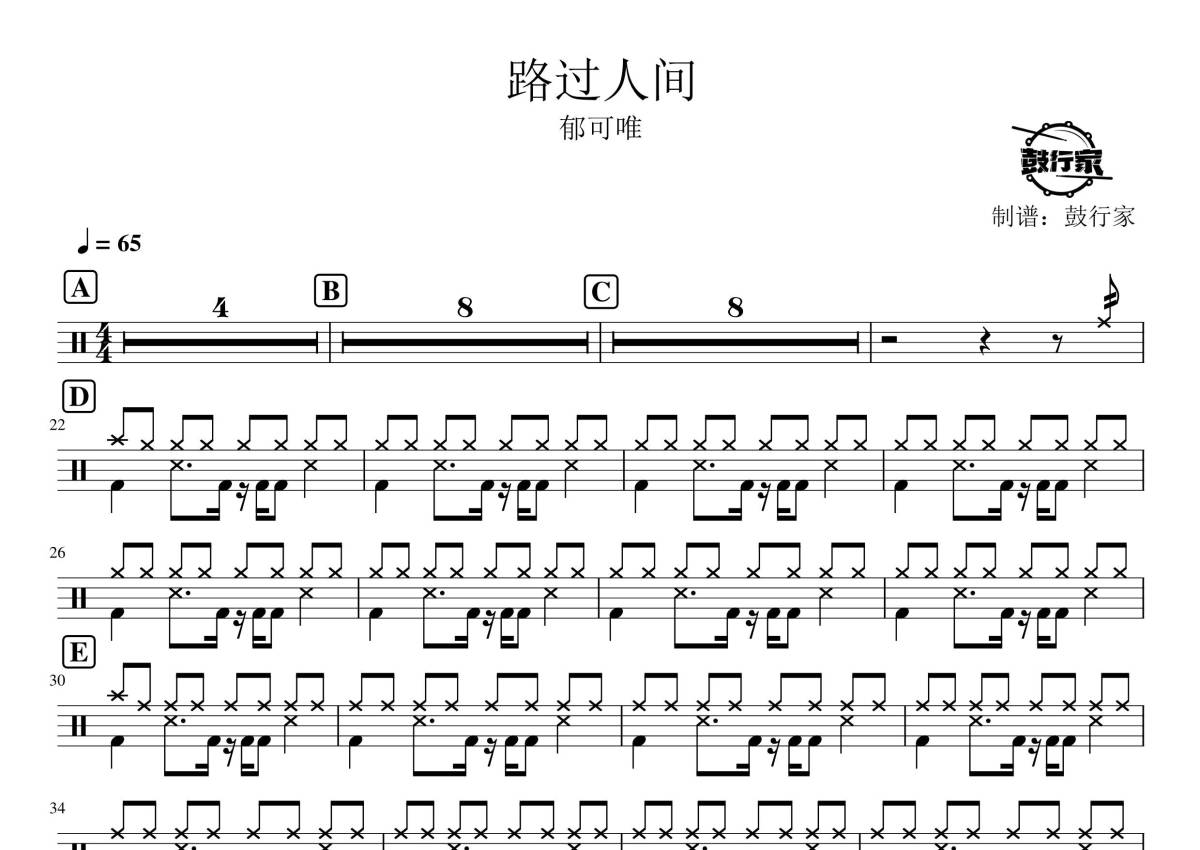 《路过人间》是郁可唯演唱的一首歌曲,拍号为4/4拍,歌曲速度为每分钟65拍,这份架子鼓谱共有一张高清图谱,图谱由 @鼓行家 编配上传,图谱使用五线谱编配,使用这份路过人间架子鼓谱,你将能够轻松地敲打出这首郁可唯的路过人间,快来尝试吧。