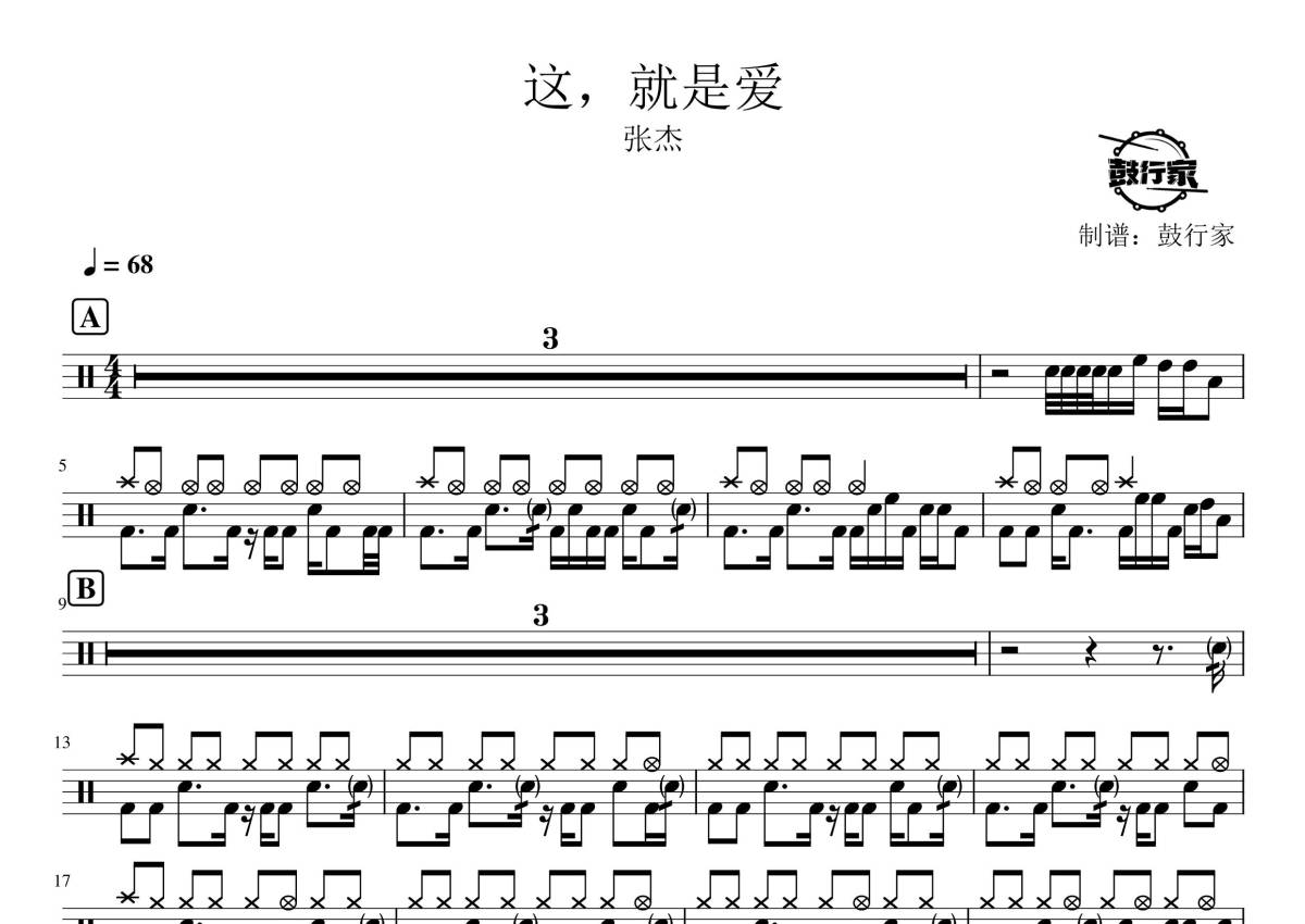 《这,就是爱》是张杰演唱的一首歌曲,拍号为4/4拍,歌曲速度为每分钟68拍,这份架子鼓谱共有两张高清图谱,图谱由 @鼓行家 编配上传,图谱使用五线谱编配,使用这份这,就是爱架子鼓谱,你将能够轻松地敲打出这首张杰的这,就是爱,快来尝试吧。