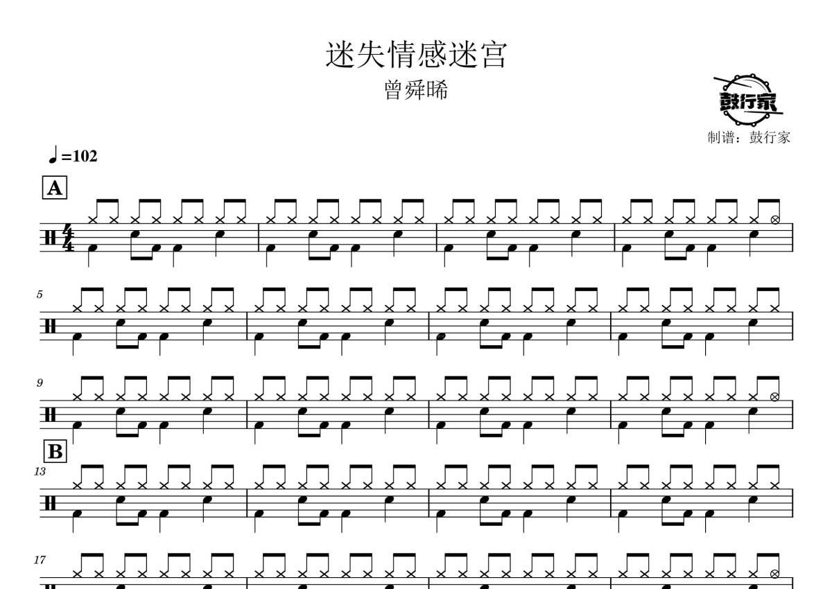 《迷失情感迷宫》是曾舜唏演唱的一首歌曲,拍号为4/4拍,歌曲速度为每分钟102拍,这份架子鼓谱共有两张高清图谱,图谱由 @鼓行家 编配上传,图谱使用五线谱编配,使用这份迷失情感迷宫架子鼓谱,你将能够轻松地敲打出这首曾舜唏的迷失情感迷宫,快来尝试吧。