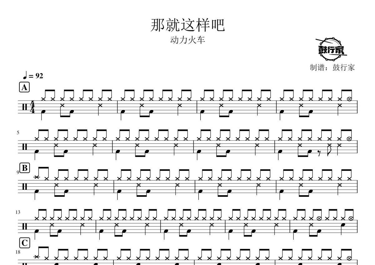 《那就这样吧》是动力火车演唱的一首歌曲,拍号为4/4拍,歌曲速度为每分钟92拍,这份架子鼓谱共有两张高清图谱,图谱由 @鼓行家 编配上传,图谱使用五线谱编配,使用这份那就这样吧架子鼓谱,你将能够轻松地敲打出这首动力火车的那就这样吧,快来尝试吧。
