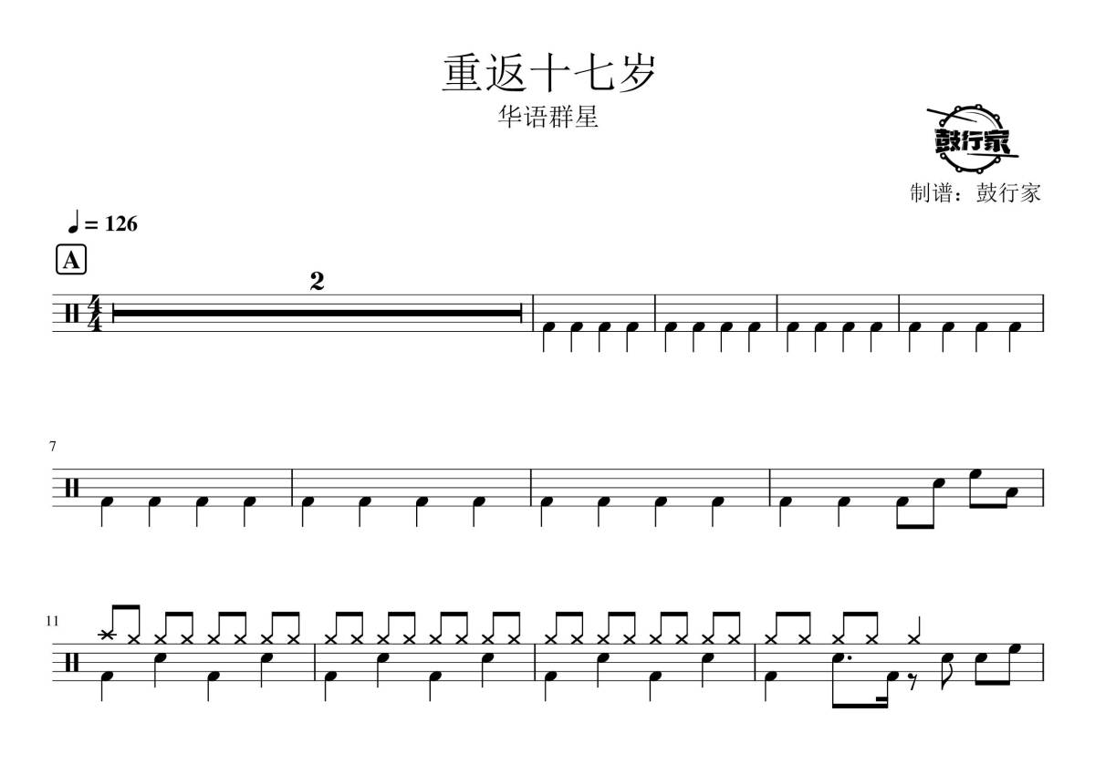 《重返十七岁》是群星演唱的一首歌曲,拍号为4/4拍,歌曲速度为每分钟126拍,这份架子鼓谱共有三张高清图谱,图谱由 @鼓行家 编配上传,图谱使用五线谱编配,使用这份重返十七岁架子鼓谱,你将能够轻松地敲打出这首群星的重返十七岁,快来尝试吧。