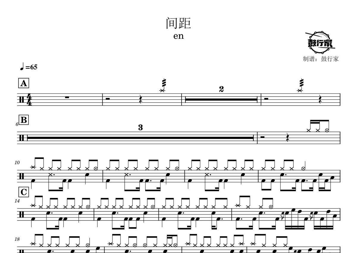《间距》是en演唱的一首歌曲,拍号为4/4拍,歌曲速度为每分钟65拍,这份架子鼓谱共有两张高清图谱,图谱由 @鼓行家 编配上传,图谱使用五线谱编配,使用这份间距架子鼓谱,你将能够轻松地敲打出这首en的间距,快来尝试吧。