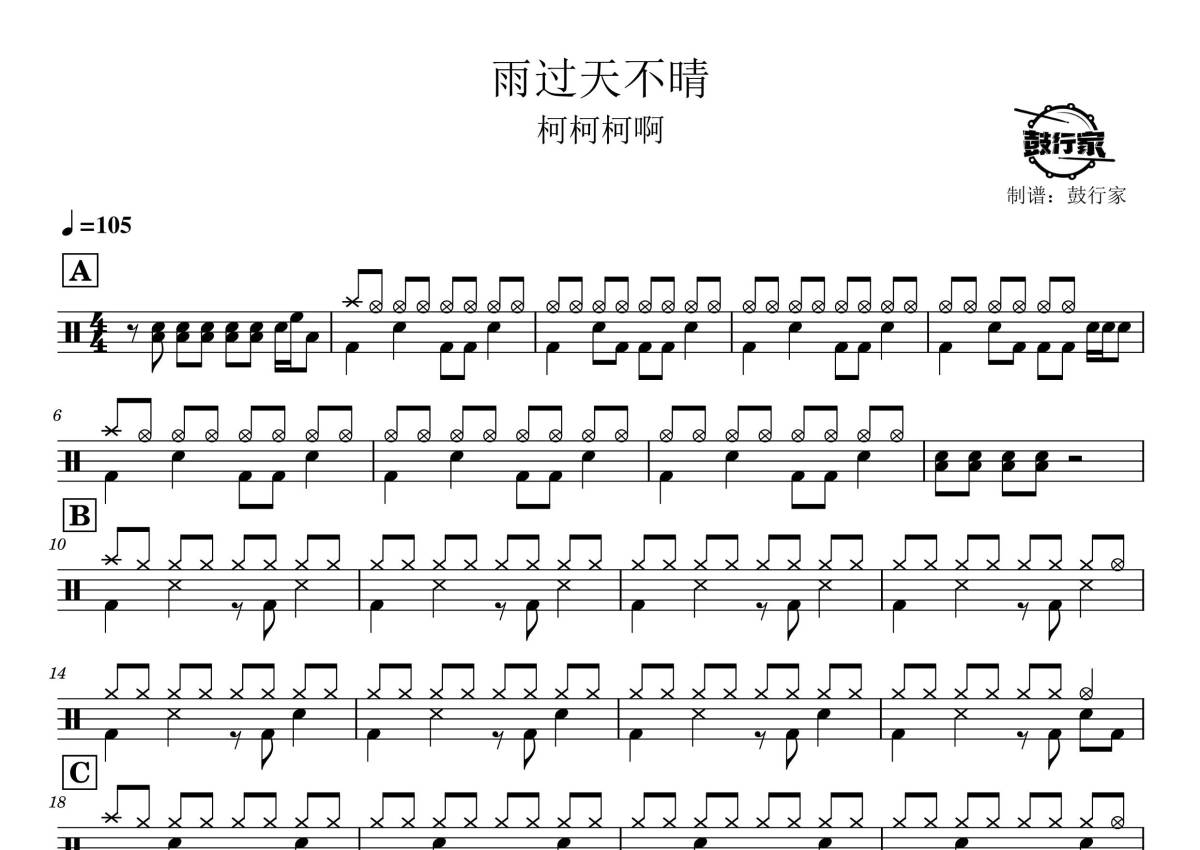 《雨过天不晴》是柯柯柯啊演唱的一首歌曲,拍号为4/4拍,歌曲速度为每分钟105拍,这份架子鼓谱共有两张高清图谱,图谱由 @鼓行家 编配上传,图谱使用五线谱编配,使用这份雨过天不晴架子鼓谱,你将能够轻松地敲打出这首柯柯柯啊的雨过天不晴,快来尝试吧。