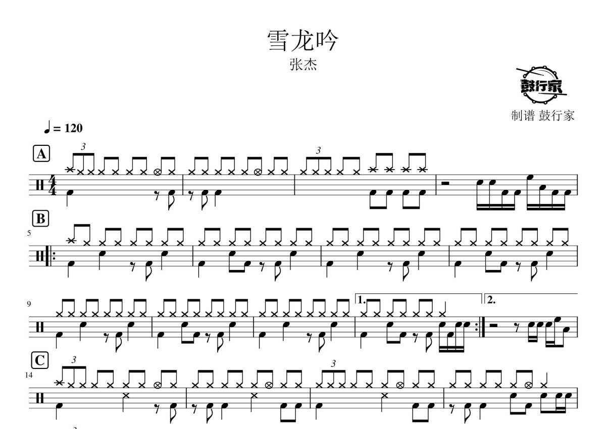 《雪龙吟》是张杰演唱的一首歌曲,拍号为4/4拍,歌曲速度为每分钟120拍,这份架子鼓谱共有两张高清图谱,图谱由 @鼓行家 编配上传,图谱使用五线谱编配,使用这份雪龙吟架子鼓谱,你将能够轻松地敲打出这首张杰的雪龙吟,快来尝试吧。