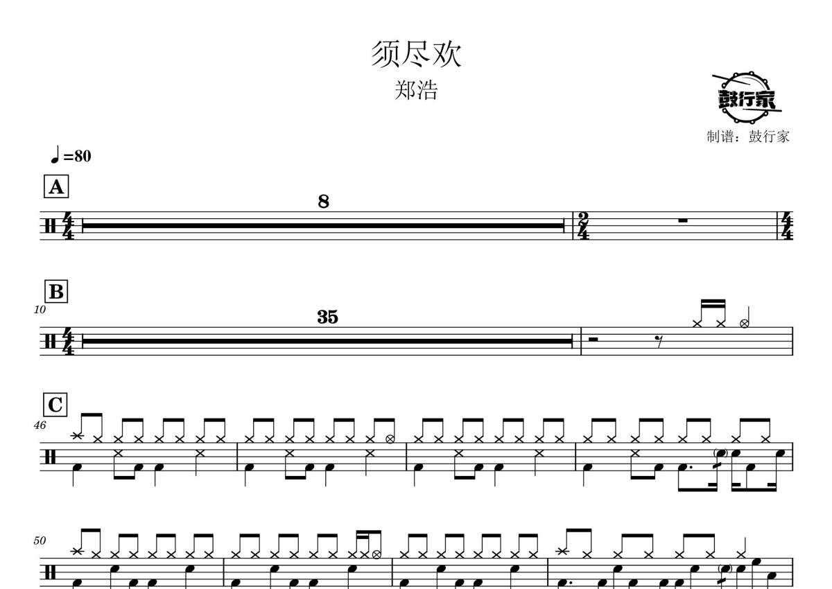 《须尽欢》是郑浩演唱的一首歌曲,拍号为4/4拍,歌曲速度为每分钟80拍,这份架子鼓谱共有两张高清图谱,图谱由 @鼓行家 编配上传,图谱使用五线谱编配,使用这份须尽欢架子鼓谱,你将能够轻松地敲打出这首郑浩的须尽欢,快来尝试吧。