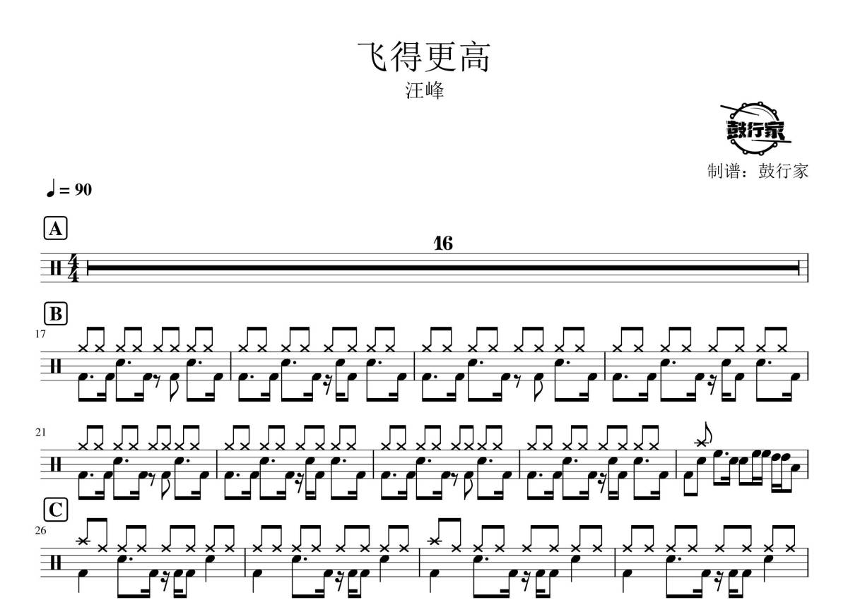 《飞得更高》是汪峰演唱的一首歌曲,拍号为4/4拍,歌曲速度为每分钟90拍,这份架子鼓谱共有两张高清图谱,图谱由 @鼓行家 编配上传,图谱使用五线谱编配,使用这份飞得更高架子鼓谱,你将能够轻松地敲打出这首汪峰的飞得更高,快来尝试吧。