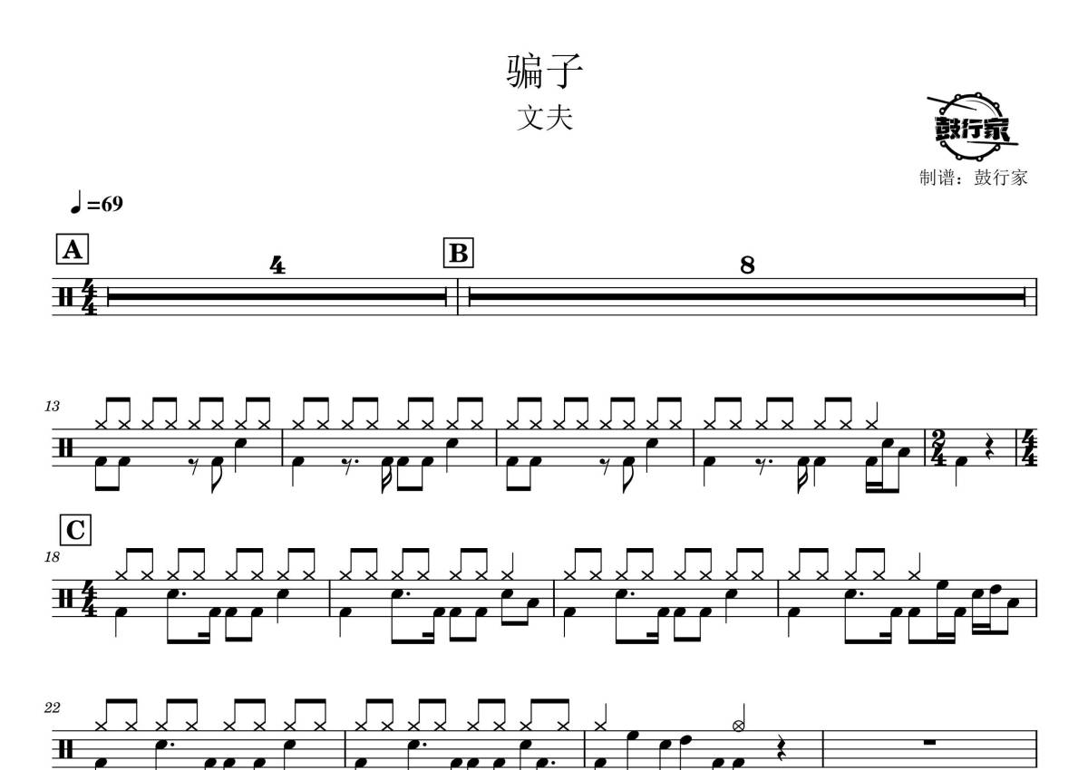 《骗子》是文夫演唱的一首歌曲,拍号为4/4拍,歌曲速度为每分钟69拍,这份架子鼓谱共有两张高清图谱,图谱由 @鼓行家 编配上传,图谱使用五线谱编配,使用这份骗子架子鼓谱,你将能够轻松地敲打出这首文夫的骗子,快来尝试吧。