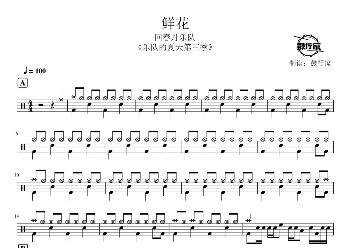 《鲜花》是回春丹演唱的一首歌曲,live,拍号为4/4拍,歌曲速度为每分钟100拍,这份架子鼓谱共有四张高清图谱,图谱由 @鼓行家 编配上传,图谱使用五线谱编配,使用这份鲜花架子鼓谱,你将能够轻松地敲打出这首回春丹的鲜花,快来尝试吧。