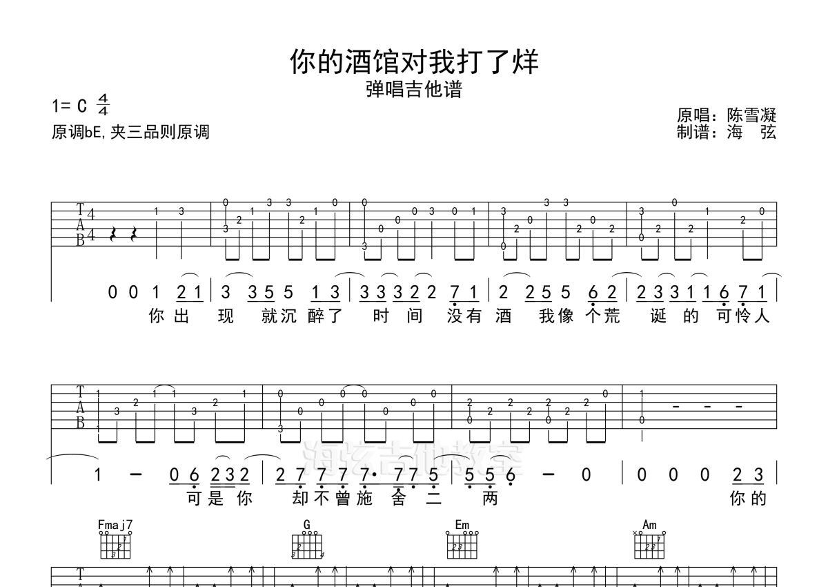 《你的酒馆对我打了烊》是陈雪凝演唱的一首歌曲,拍号为4/4拍,歌曲原调为Eb调,但由于原调指法比较难,为了方便弹奏,本吉他谱采用的是C调指法编配,变调夹3品弹奏即为原调,当然也可以根据自己的音域改变变调夹位置,或者通过改变和弦调性,以方便自己弹奏,这份吉他谱共有两张高清图谱,图谱由 @海弦 编配上传,图谱使用六线谱编配,包含吉他和弦指法、简谱以及歌词部分,使用这份你的酒馆对我打了烊吉他谱,可以让你更加方便地掌握这首歌曲的弹唱技巧,快来尝试吧。